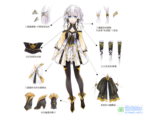 以白色晚禮服為主要元素下身體穿著黑絲襪,並配上三稜鏡髮飾中間為七彩色衣服上也有七彩色線條代表其的光屬性。