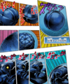 荒木表示,這個替身類似迴音的黑化版,有點惡魔少年的感覺。而莫西幹頭造型的尖刺帶有危險的氣息。