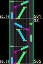 難點主要是噁心橙鍵和騙手配置,122-131combo之間出現兩個八分假橙藍雙押,沒有開雙押提示又或者調高了回退亮度的人很容易在這段爆great/bad。兩段副歌都出現騙手黃鍵。而第一段後面的過渡段是整個譜面裡最困難且最卡手的部分,562-639combo出現紅斜黃鍵雙押再加跨屏粉條和橙鍵的這種讀譜難度極高的配置,而且還出現了六次,完全沒有給玩家足夠的反應時間,玩家需要用按著斜黃鍵的手去接住中間的粉鍵然後拉動至相應的軌道(詳細手法請見左圖)。結尾也有大量的單手連點,許多玩家在這部分體力透支而痛失FC。